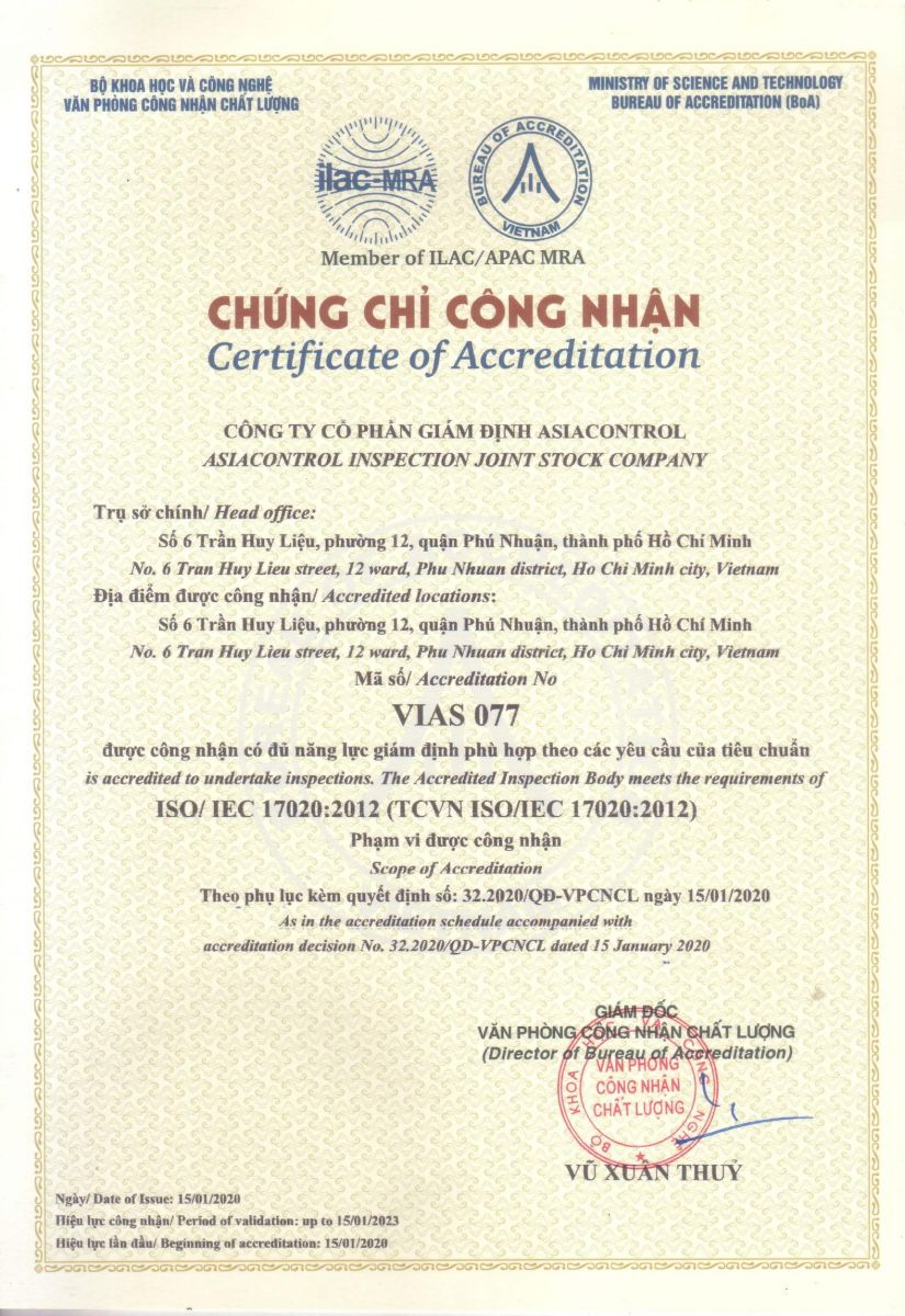 Jan 2020, Asiacontrol has been evaluated and accredited by BoA with the Quality Management System to be conformed to the ISO 17020 :2012 - VIAS 077